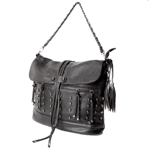 Accessoryo - Noir Faux Cuir Dames Sac À Main Clouté Avec Crâne Et De Pompons